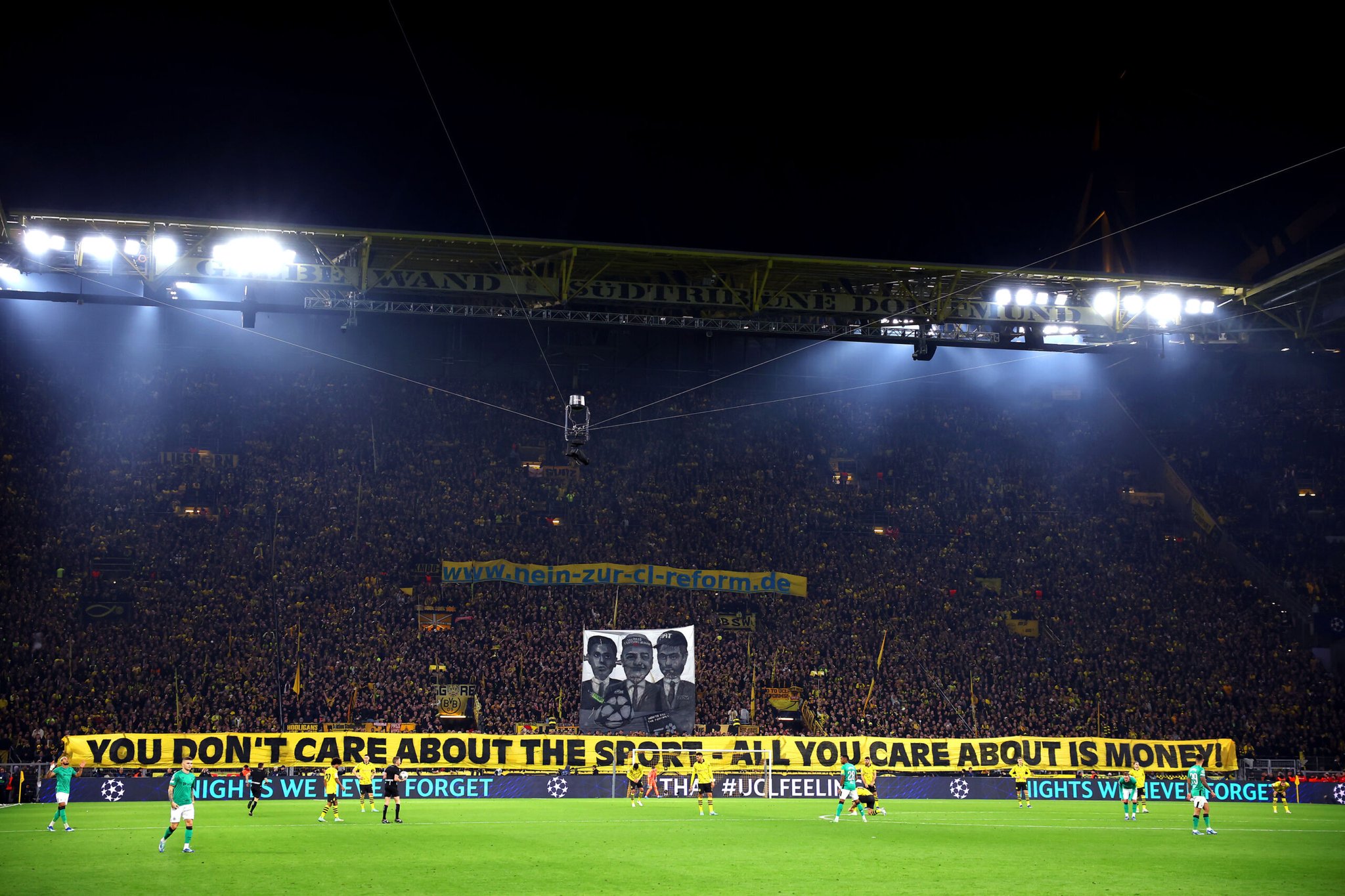 ونظمت جماهير بوروسيا دورتموند الألماني وقفة احتجاجية في مدرجات ملعب سيجنال إيدونا بارك في ألمانيا، ضم الاتحاد الأوروبي لكرة القدم “يويفا”.
