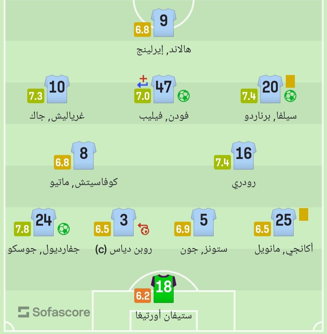 وحصل ستونز جون على معدل 6.9، والنرويجي إيرلينج هالاند على 6.8، ودياز وأكانجي على تقييم 6.5