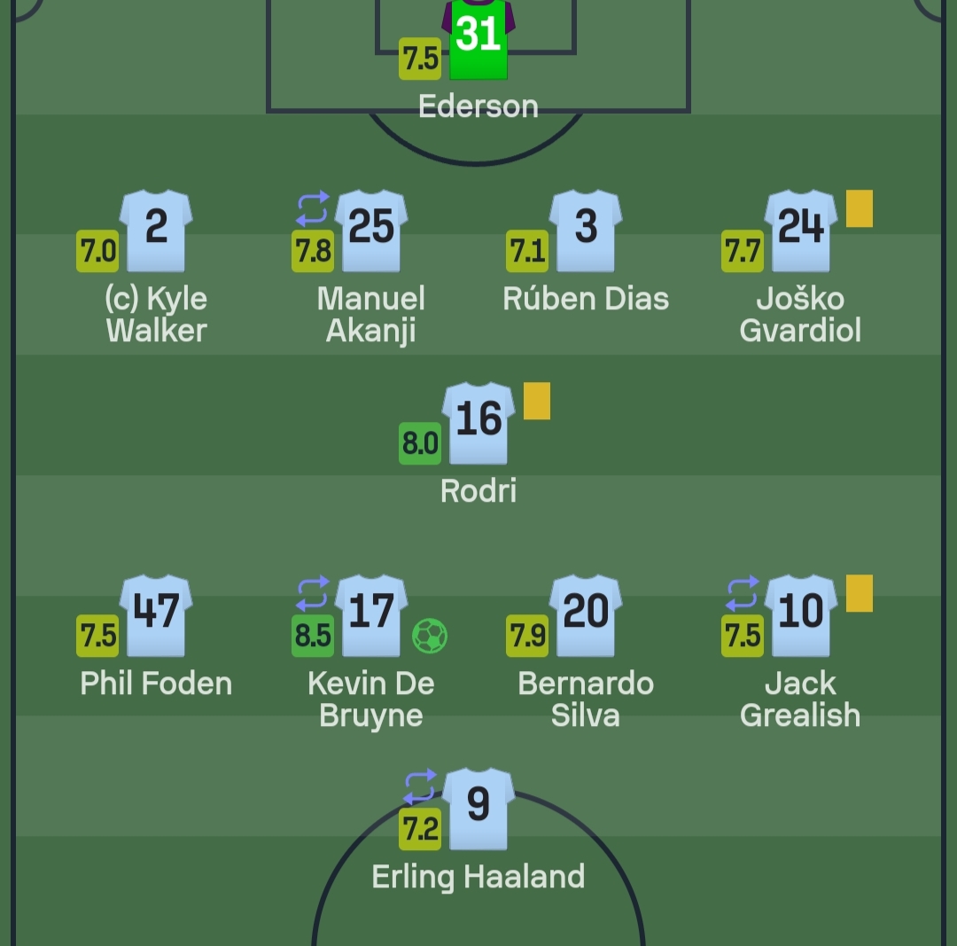 وحصل برناردو سيلفا على 7.9، بينما جاء تقييم هالاند بـ7.2 درجة، ويعد ووكر هو الأقل تقييمًا بـ 7.0.