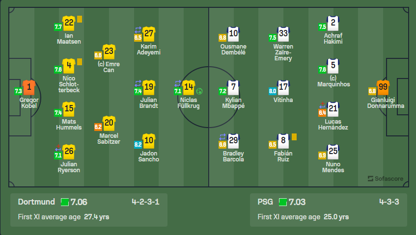 كشفت شبكة “سوفا سكور” للأرقام والإحصائيات، عن تقييم لاعبي بروسيا دورتموند وباريس سان جيرمان، في مباراة نصف نهائي دوري أبطال أوروبا.