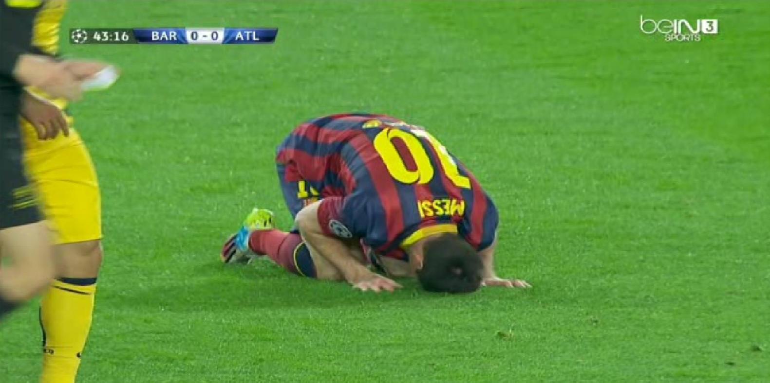 ميسي أهدر فرصة هدف محقق في مباراة سابقة لـ البارسا ضد أتلتيكو مدريد في دوري أبطال أوروبا، لتكون ردة فعله هي السجود.