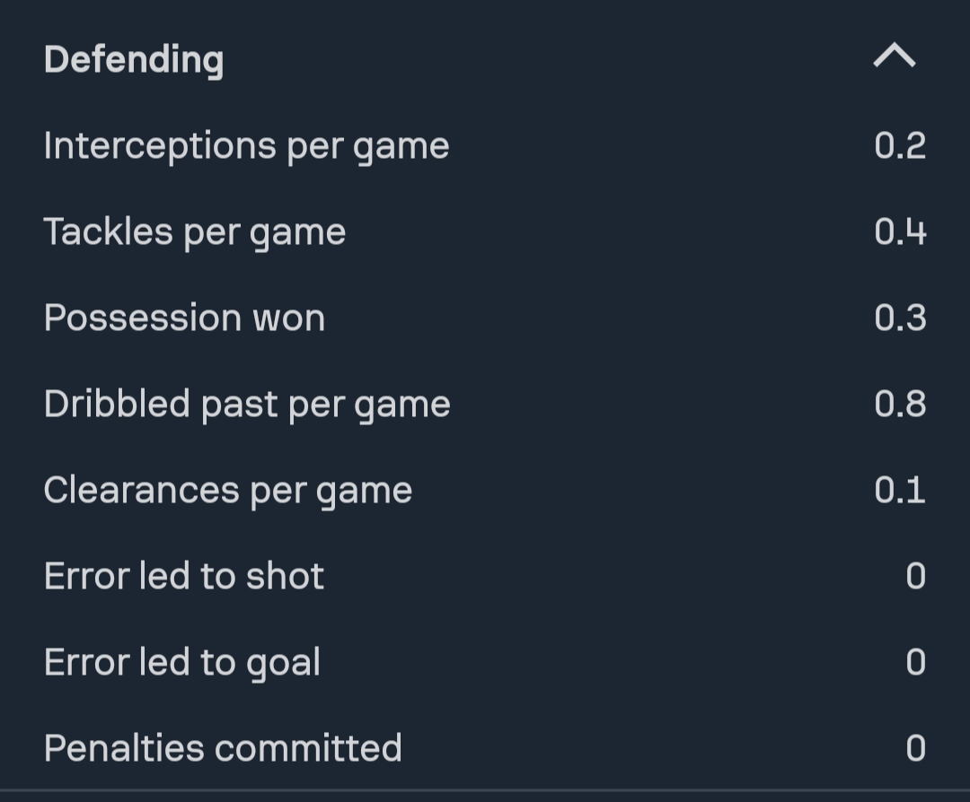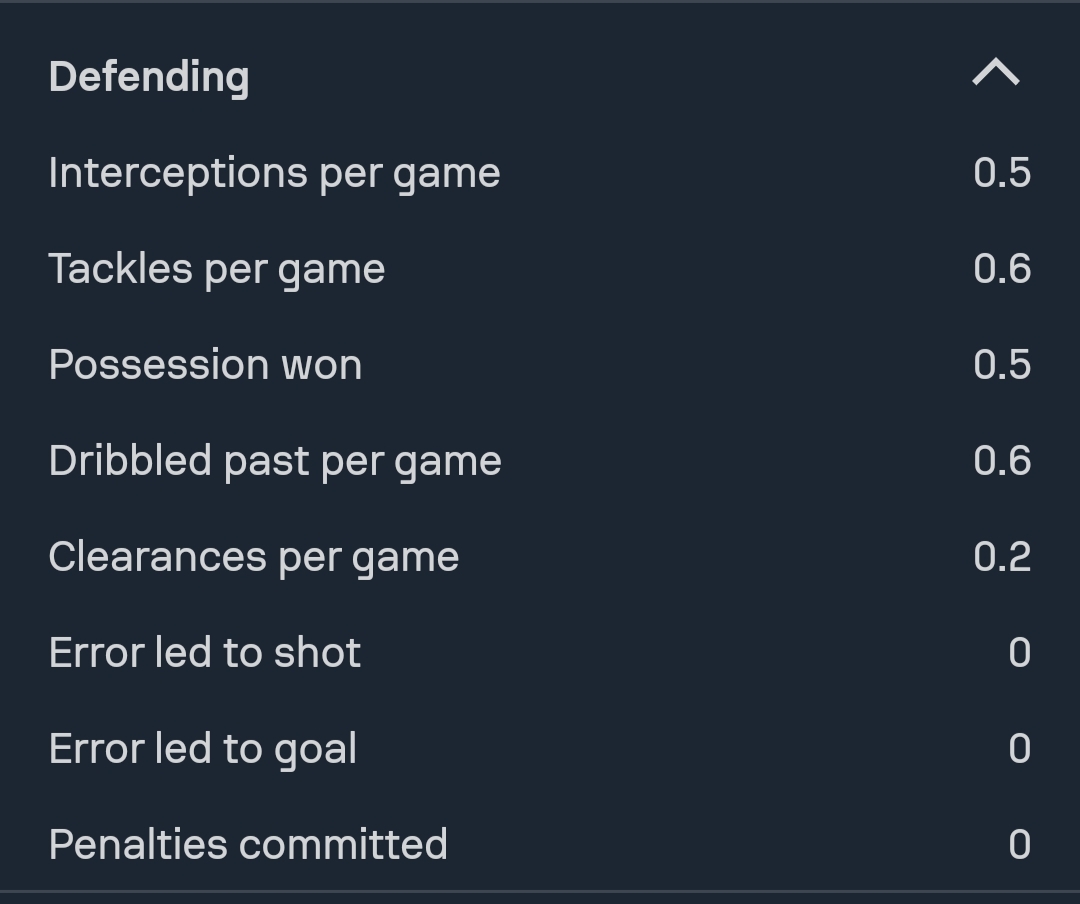 وسجل 4 أهداف ونسبة الأهداف في المباراة بلغت 0.2، ونسبة التسديد على المرمى في المباراة الواحدة 0.7، وإهدار فرص محققة نسبتها (1)، وأهدافه من داخل منطقة الجزاء عددها 3 / 22 وأهداف من خارج المنطقة 1/10، حيث أحرز أهدافه الأربعة بقدمه اليمنى، وحصل على ركلة جزاء وحيدة.