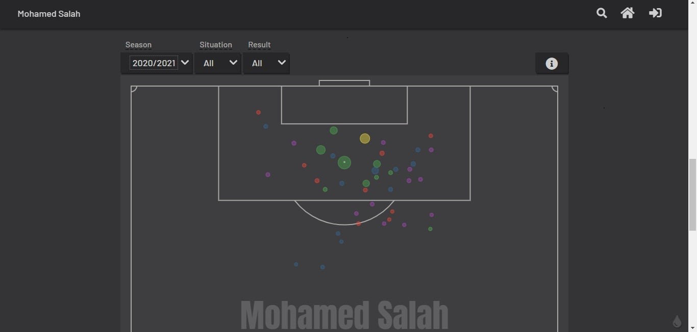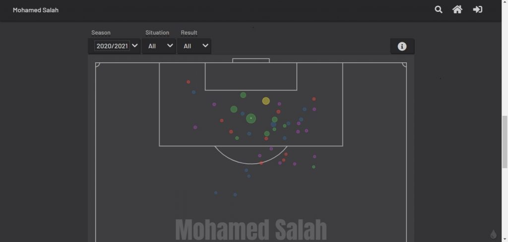 النقط الخضراء هي التصويبات التي انتهت بالأهداف وكلما اتسعت النقطة كلما زادت نسبة دخولها المرمى أي أنها فرصة سهلة، الصفراء هي التسديدات التي ارتطمت بالقائم، بينما الحمراء تعبر عن التصويبات التي أخطأت طريق المرمى، والزرقاء هي التي أنقذها حارس الخصم، والنقط البنفسجية هي التسديدات التي تم التصدي لها من قبل مدافعي الخصوم.