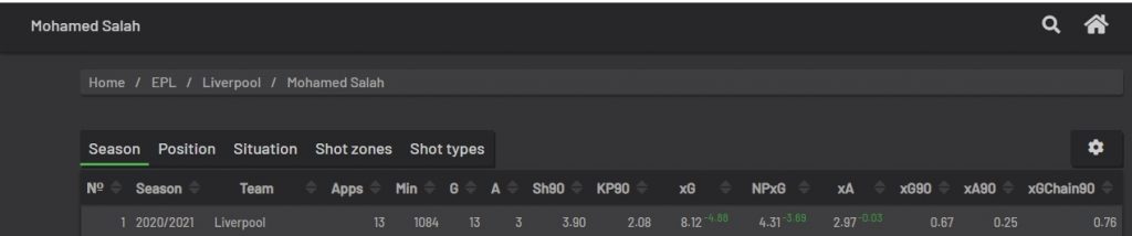 عدد الاهداف المتوقعة لصلاح بعد 14 مباراة في الدوري الإنجليزي كان 8.12 هدف، لكن الفرعون المصري  سجل 13 هدف بفارق إيجابي له قُدر بـ4.88 هدف.