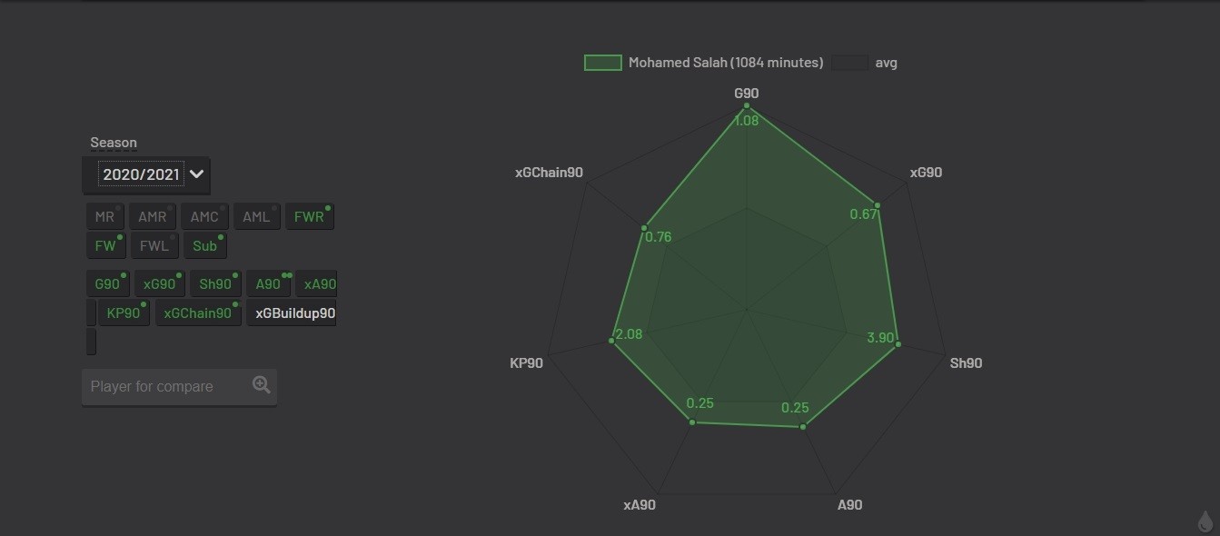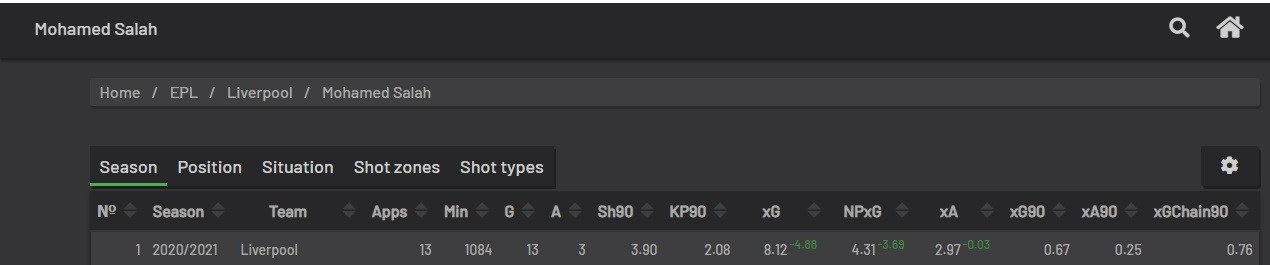 هنا لايهمنا سوا ثلاث إحصائيات وهي XG، NPXG، XA، الأولى تعني عدد الأهداف المتوقعة لصلاح والثانية عدد الأهداف المتوقعة دون تسديد ضربات الترجيح أما الأخيرة فهي عدد صناعة الأهداف التي يمكن لصلاح تقديمها لزملاؤه.