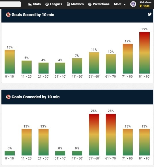 الصورة السابقة توحي بنسبة تسجيل الأهلي واستقباله للأهداف خلال دقائق المباراة، فنرى هنا أن الأهلي يكثف هجومة خلال آخر دقائق المباراة بينما نسبة استقبال الأهداف تزداد في بداية الشوط الثاني للمباراة وخاصة من الدقيقة الـ50 لـ70.