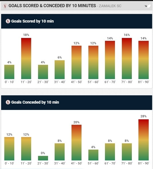 الزمالك يفتح خطوطه تماما في آخر دقائق المباراة فيستقبل الزمالك أكثر أهدافه خلال العشر دقائق الأخيرة من عمر اللقاء فيجب على الفارس الأبيض توخي الحذر في ذلك، بينما أكثر الدقائق التي يسجل فيها الزمالك في شباك الخصوم جاءت في نهاية شوطي المباراة وأول دقائق النصف النهائي للمباراة
