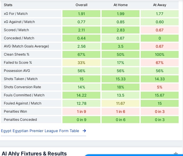 وبعد كل هذا فالأهلي يمتلك أعلى معدل للأهداف المتوقعة خلال المباراة الواحدة “XG” خلال منافسات الدوري المصري لهذا الموسم، وبقية إحصائيات الأهلي في الصورة السابقة.