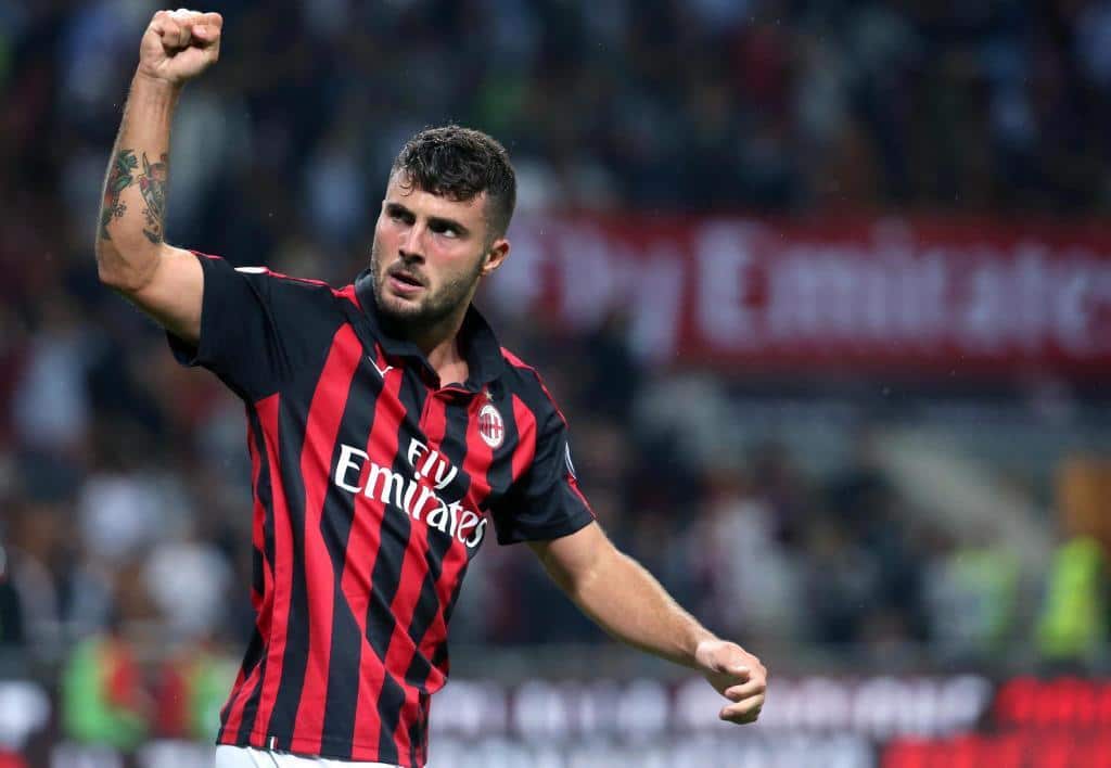 BAZ100. Milan (Italy), 31/08/2018.- Milan's Patrick Cutrone (C) jubilates after scoring a goal during the Italian Serie A soccer match AC Milan vs AS Roma at Giuseppe Meazza stadium in Milan, Italy, 31 August 2018. (Italia) EFE/EPA/MATTEO BAZZI