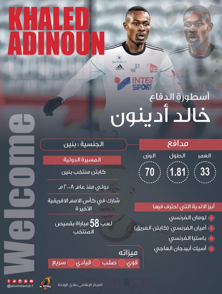 أعلن مجلس أدارة نادي الوحدة السعودي برئاسة سلطان أزهر عن ضم المدافع الدولي البنيني خالد أدينون إلى صفوف الفريق، خلال الميركاتو الصيفي الحالي، قادمًا من نادي أميان الفرنسي لمدة موسمين.