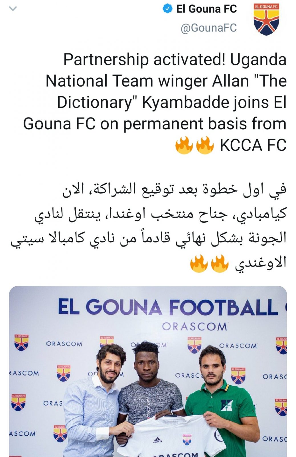 وكتب النادي عبر الحساب الرسمي على موقع التواصل الاجتماعي “تويتر”: “في أول خطوة بعد توقيع الشراكة، الآن كيامبادي جناح منتخب أوغندا ينتقل لنادي الجونة بشكل نهائي قادمًا من نادي كامبالا سيتي الأوغندي”.