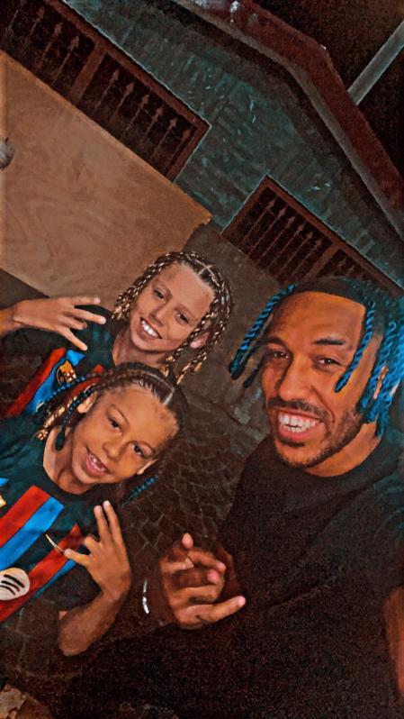 نشر أوباميانج صورة تجمعه بطفلين يرتديان قميص برشلونة في موطنه، الجابون، والتي ظهر فيها بـ قصة شعر جديدة.