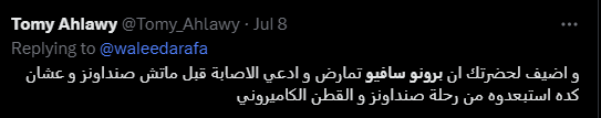 وكتب مشجع:” برونو سافيو تمارض وادعى الإصابة قبل ماتش صنداونز وعشان كده استبعدوه من رحلة صنداونز والقطن الكاميروني “.
