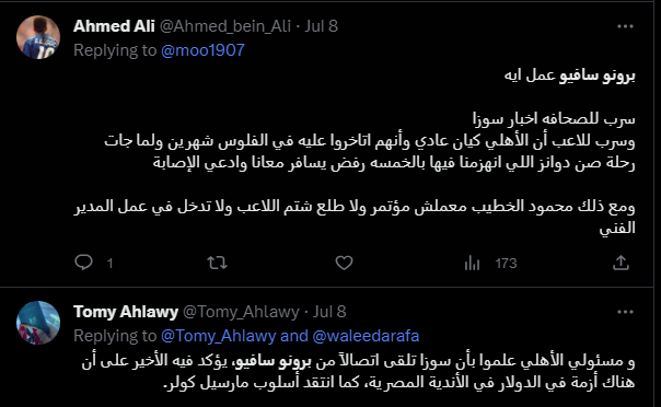 وكتب أخر:” برونو سافيو عمل إيه.. سرب للصحافة أخبار سوزا، وسرب للاعب أن الاهلي كيان عادي وأنهم أتاخروا عليه في الفلوس شهرين “.