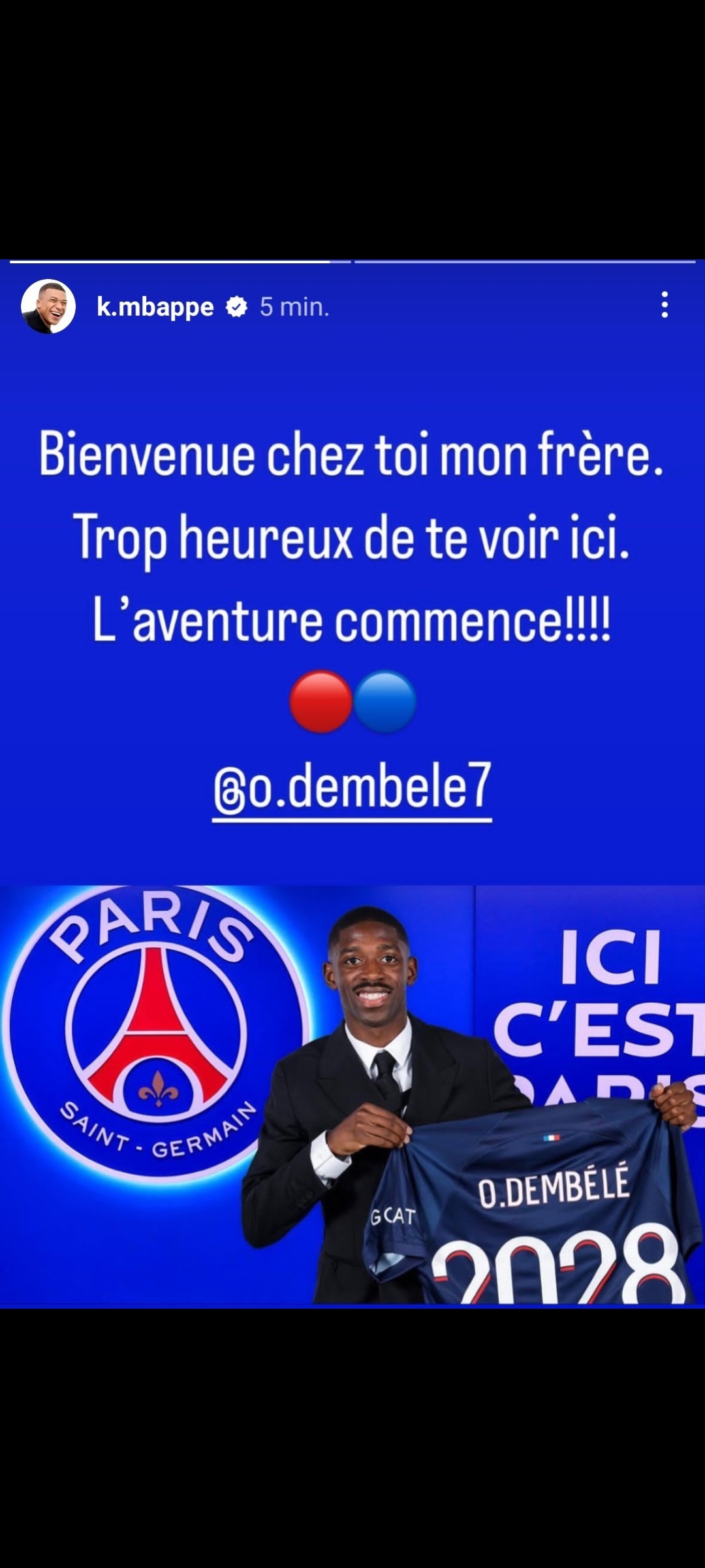 وجاء ترحيب مبابي بـ ديمبيلي في الحساب الرسمي لـ كيليان على موقع “إنستجرام”، حيث بعث رسالة، ونشر صورة تجمعهما.