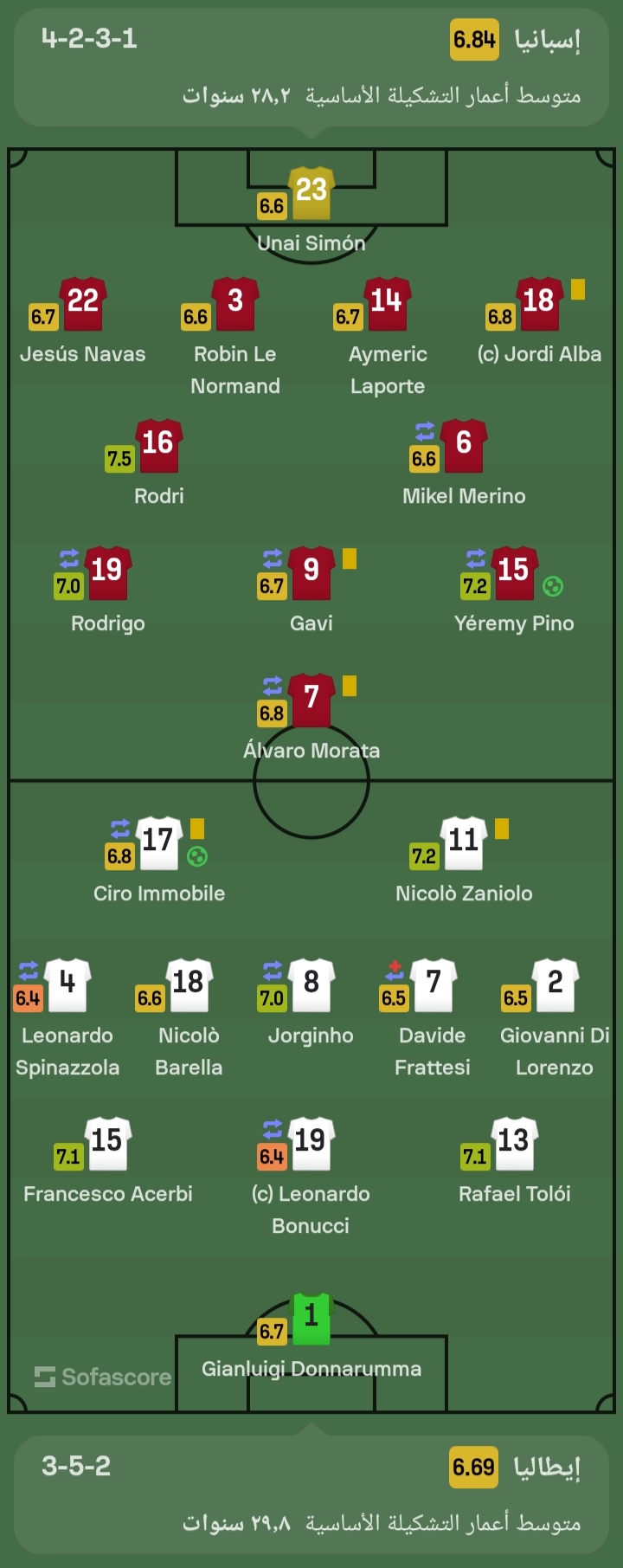 في الجهة المقابلة، حصل أفضل لاعب في منتخب إيطاليا، وهو نيكولو زانيليو على تقييم 7,2، بينما كان الأسوأ هو ليوناردو سبينازولا، وليوناردو بونوتشي، بعدد درجات 6,4.