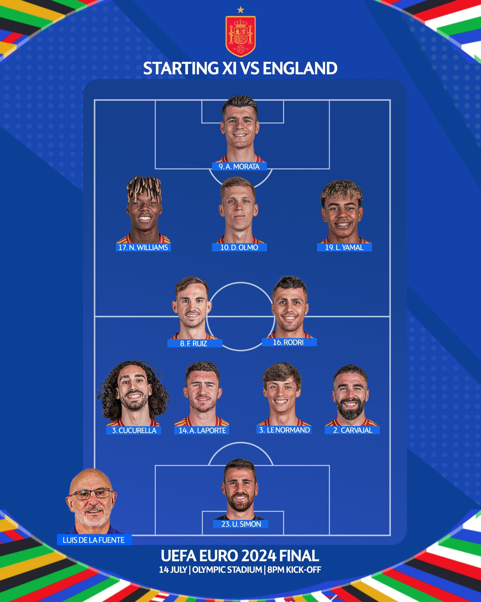 خط الهجوم: لامين يامال – ألفارو موراتا – نيكو ويليامز.