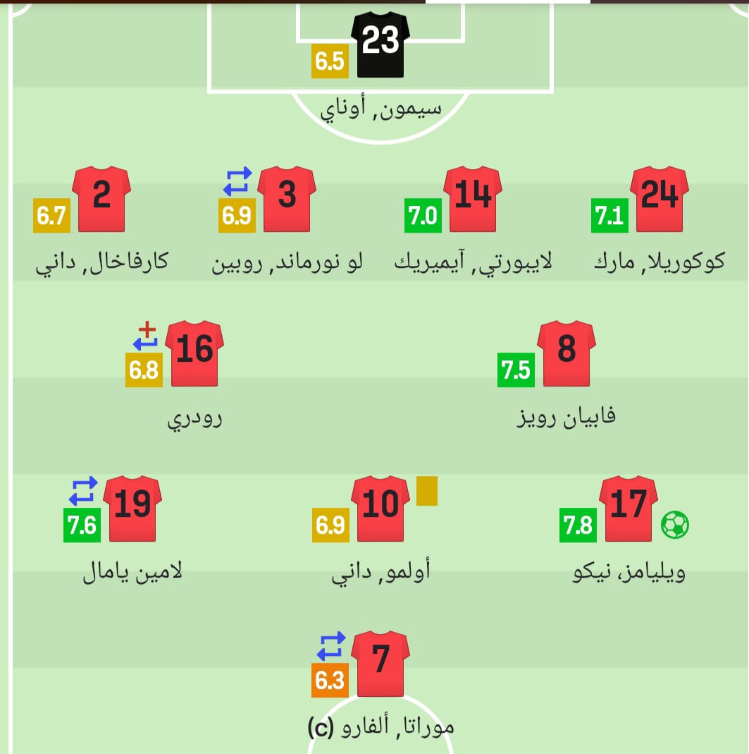 وحصل ويليامز نيكولاس لاعب منتخب إسبانيا على أعلى تقييم في المباراة بدرجة 7,8 وفقًا لموقع سوفا سكور، بينما كان الأقل تقييمًا هو ألفارو موراتا نجم الماتادور بدرجة 6,3.