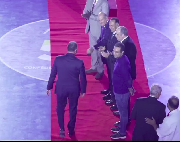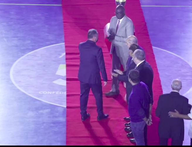 الأمين رئيس الاتحاد المصري للعبة، والبنيني منصورو أريمو رئيس الاتحاد الإفريقي، بالإضافة لأحمد مرتضى منصور المسؤول عن قطاع الصالات في نادي الزمالك.