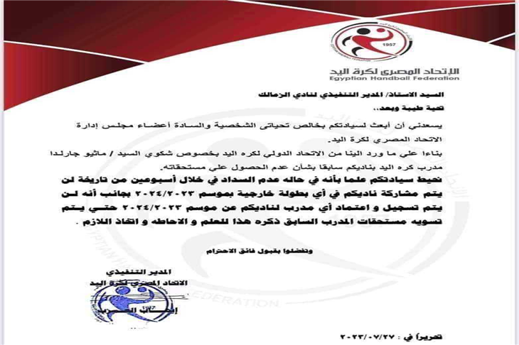 وتلقي الاتحاد المصري لكرة اليد خطاب من الاتحاد الدولي بخصوص عدم سداد نادي الزمالك مستحقات مدربه السابق الإسباني ماثيو جارالدا.