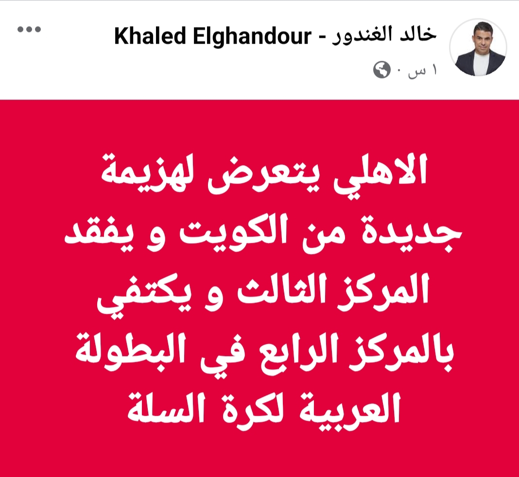 وكتب الغندور عبر حسابه بموقع التواصل الاجتماعي “تويتر”: “الاهلي يتعرض لهزيمة جديدة من الكويت ويفقد المركز الثالث و يكتفي بالمركز الرابع في البطولة العربية لكرة السلة”.