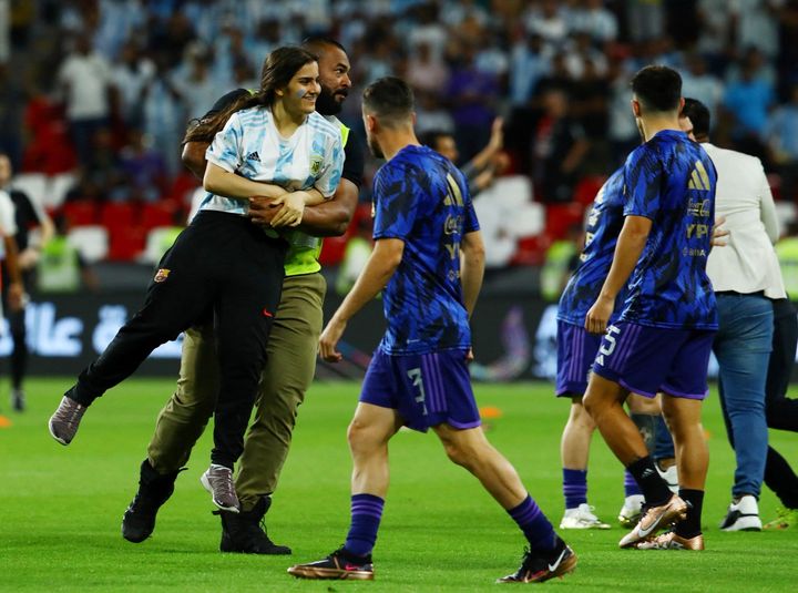 واقتحمت مشجعة أرض ستاد محمد بن زايد ملعب مباراة الأرجنتين والإمارات من أجل مصافحة ليونيل ميسي.