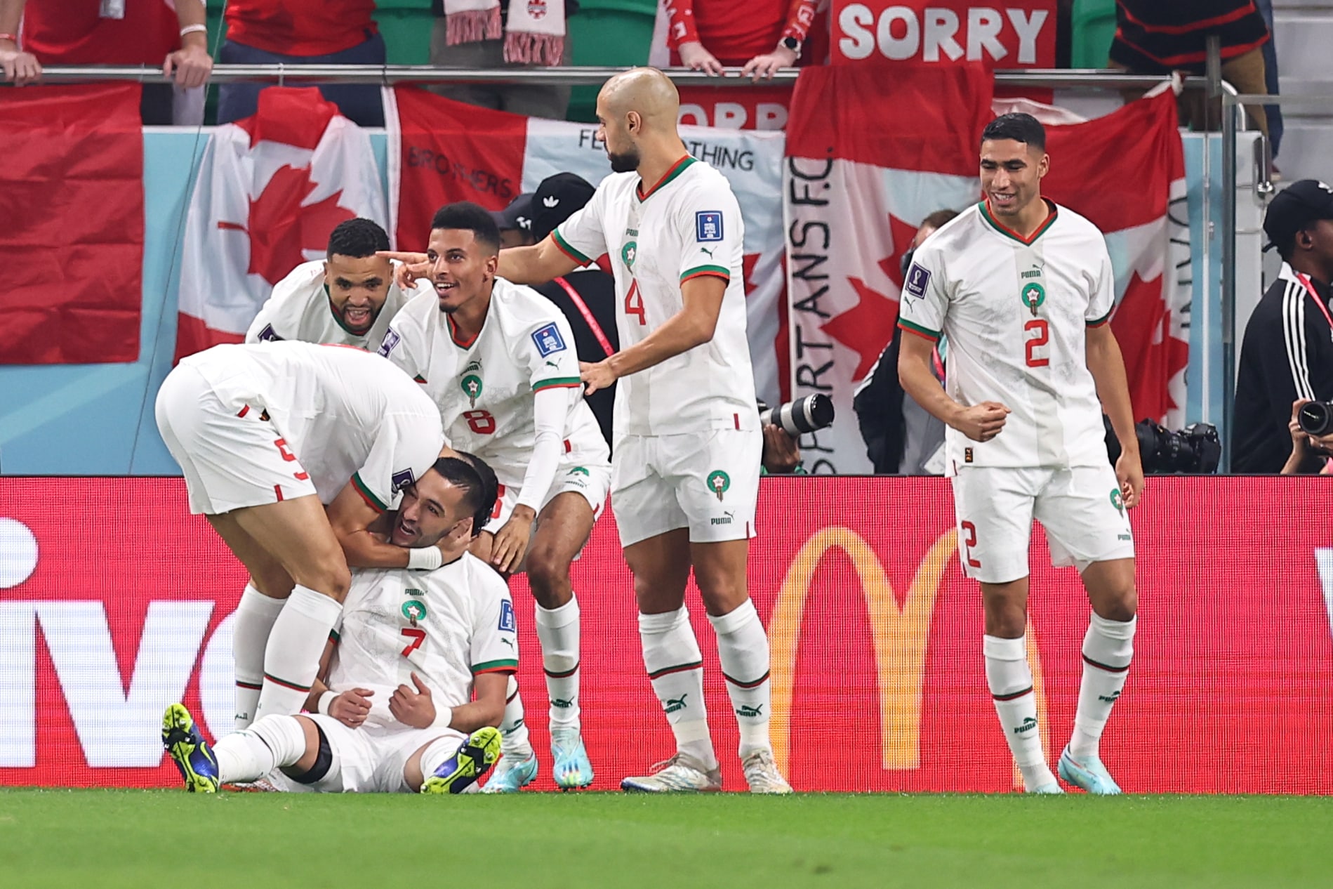 احتفل لاعبو منتخب المغرب والجهاز الفني بقيادة وليد الركراكي في أرضية الملعب عقب الفوز على كندا وحسم تأهلهم بشكل رسمي لثمن نهائي كأس العالم 2022.