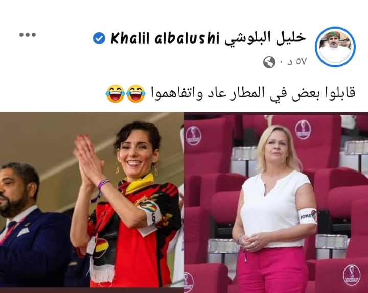 وظهرت حجة لحبيب، وزيرة الخارجية البلجيكية، في مدرجات ملاعب قطر، وهي ترتدي شارة دعم المثلية الجنسية، كما هو الحال لنانسي فيزر وزيرة الداخلية الألمانية، وهو ما أثار غضب الجميع.