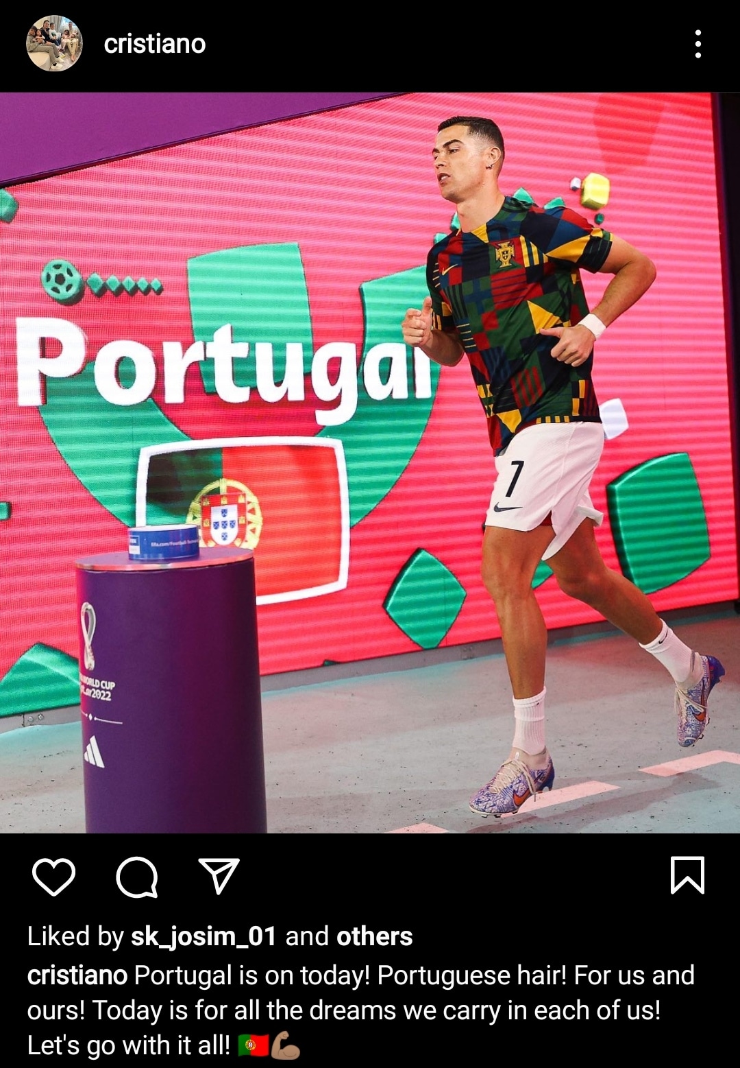 كتب رونالدو عبر حسابه الشخصي على موقع التواصل الإجتماعي “انستجرام”: “يوم البرتغال، من أجل البرتغاليين، لنا وللجميع.. اليوم لجميع الاحلام التي يحملها كل فرد منا، دعونا نذهب بكل طاقتنا.”