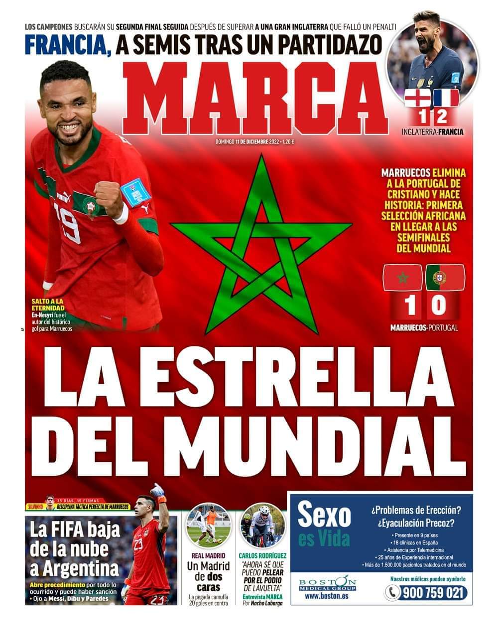 ونشرت جريدة ماركا الإسبانية،صورة لعلم المغرب على غلاف اليوم معلقة “نجمة المونديال”.