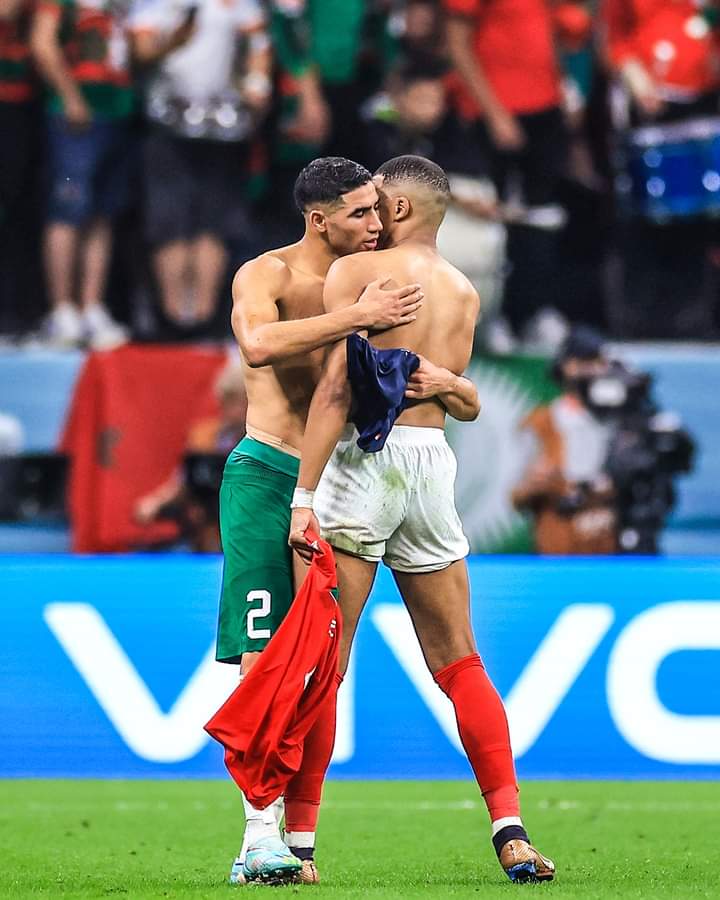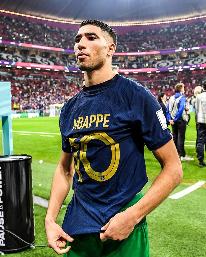 وحرص الثنائي اللذان يلعبان رفقة باريس سان جيرمان الفرنسي على تبادل القمصان مع بعضهما البعض حيث ارتدى كيليان مبابي القميص المغربي في حين ارتدى حكيمي قميص منتخب فرنسا.