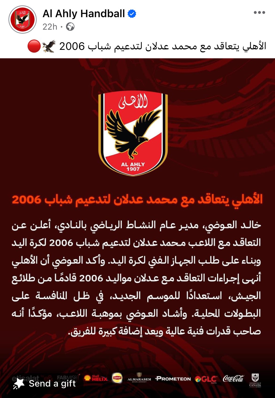وقال عدلان مواليد 2006، عبر ظهوره في مقطع الفيديو: “أنا محمد عدلان لاعب فريق طلائع الجيش لكرة اليد، أعلن أن رغبتي الأولى والأخيرة هي اللعب لنادي الزمالك وهذا حلم بالنسبة لي ولي الشرف أن أكون في القلعة البيضاء”.