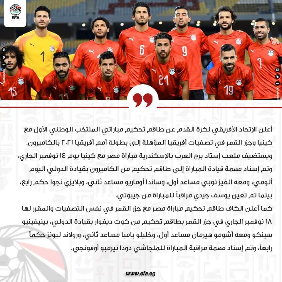 واختارت لجنة الحكام طاقم تحكيم كاميروني لإدارة مباراة منتهب مصر أمام كينيا يوم 14 نوفمبر الجاري، بقيادة الحكم الدولي اليوم ألومي، ويعاونه الفيز نوبي مساعد أول، وساندا أوماريو مساعد ثاني، وبلايزي نجوا حكمًا رابعًا، بينما تم تعين يوسف جيدي مراقباً للمباراة من جيبوتي، وتقام المباراة على ملعب إستاد برج العرب بالإسكندرية.